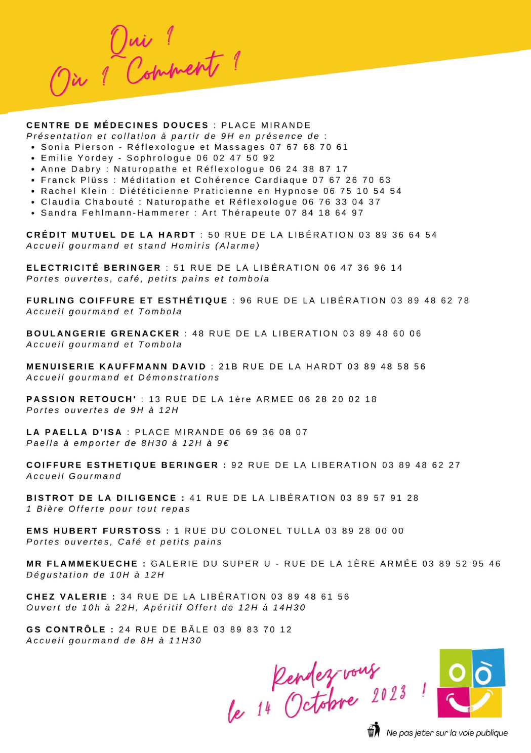Vingt prestataires locaux accueillent le public lors de la journée nationale du commerce de proximité, de l’artisanat et du centre ville. Une tombola permet de gagner un gros lot, composé de 20 lots, d’une valeur totale de 600 €.