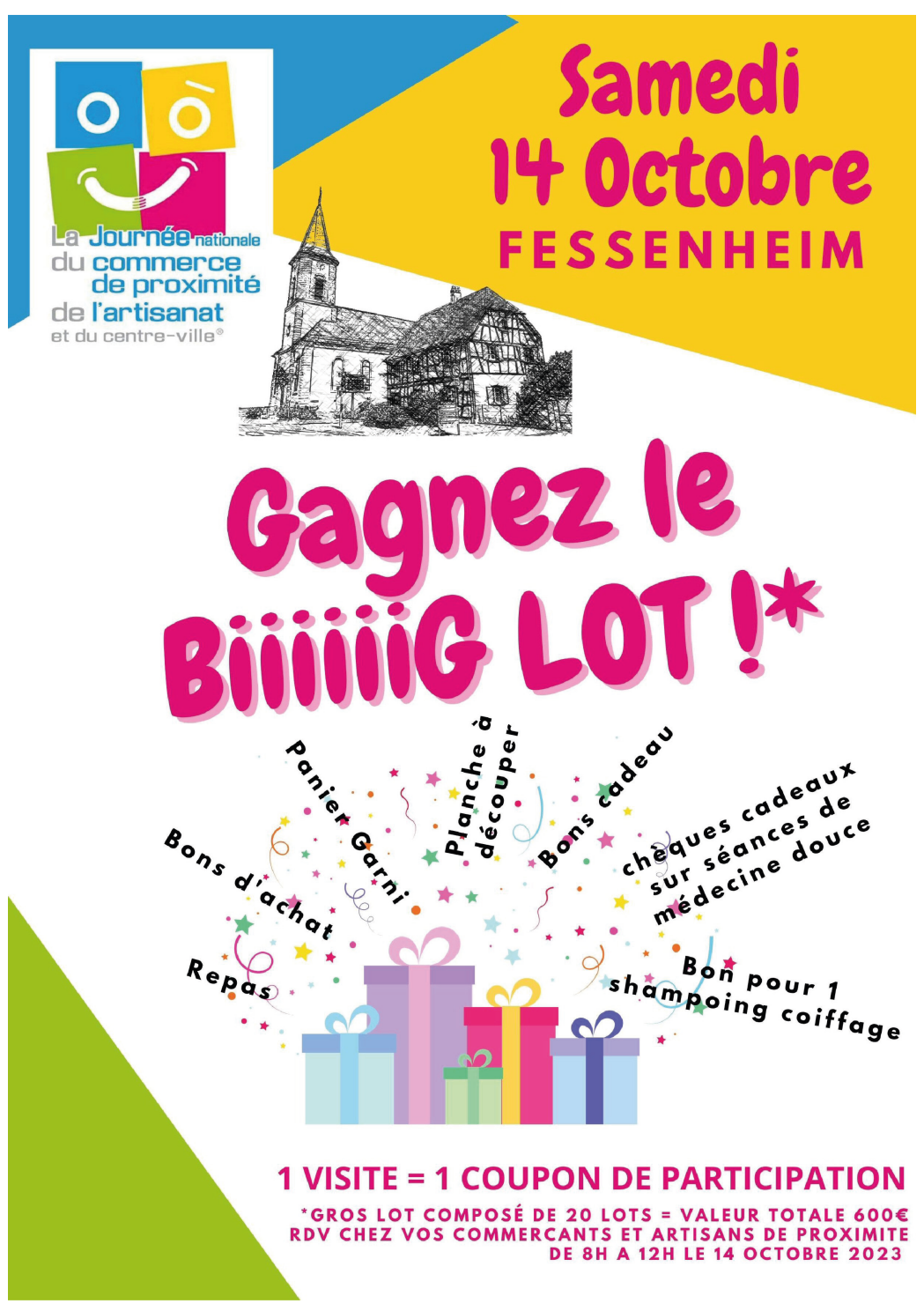 Vingt prestataires locaux accueillent le public lors de la journée nationale du commerce de proximité, de l’artisanat et du centre ville. Une tombola permet de gagner un gros lot, composé de 20 lots, d’une valeur totale de 600 €.