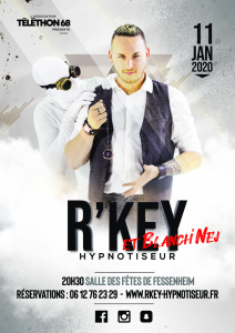 Joël R’Key, hypnotiseur, est le parrain du Téléthon 2019 du Haut- Rhin (secteur nord). À ce titre il a décidé avec Yannick Méal, coordinateur, et toute l’équipe de bénévoles du Téléthon à Fessenheim, de mettre tout son talent au profit de l’AFM en offrant son spectacle : R’Key et Blanch’Nej.