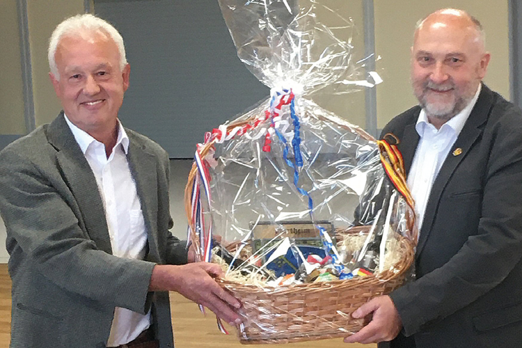 Bernhard Pfrengle (à gauche) remet un cadeau à Claude Brender au nom de la commune de Hartheim am Rhein.