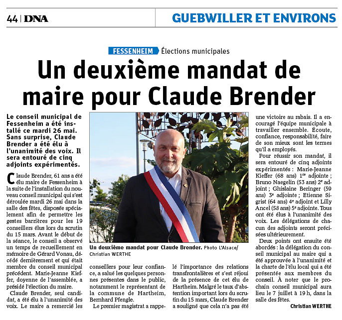 Le conseil municipal élu le 15 mars a, enfin, pu être installé. Pour respecter les consignes sanitaires de rigueur, la séance s’est tenue à la salle des fêtes. Claude Brender a été élu à l’unanimité des voix pour un deuxième mandat de maire. Le conseil a également reconduit le mandat des 5 adjoints sortants : Marie-Jeanne Kieffer, Bruno Naegelin, Ghislaine Béringer, Étiennne Sigrist et Lilly Ancel. Leurs attributions seront définies prochainement.
