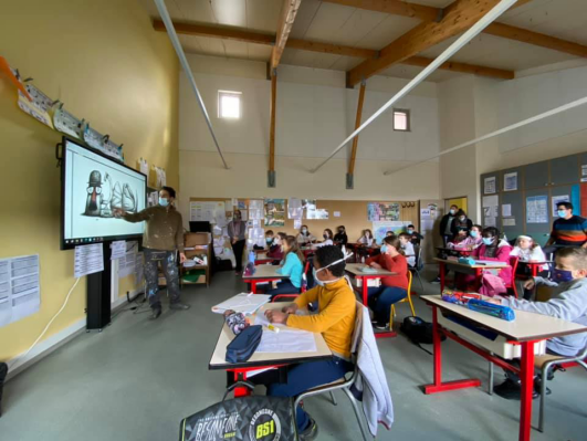 Mardi 16 mars, les élèves de l’école élémentaire ont ainsi eu la chance de voir arriver l’artiste dans la cour.
