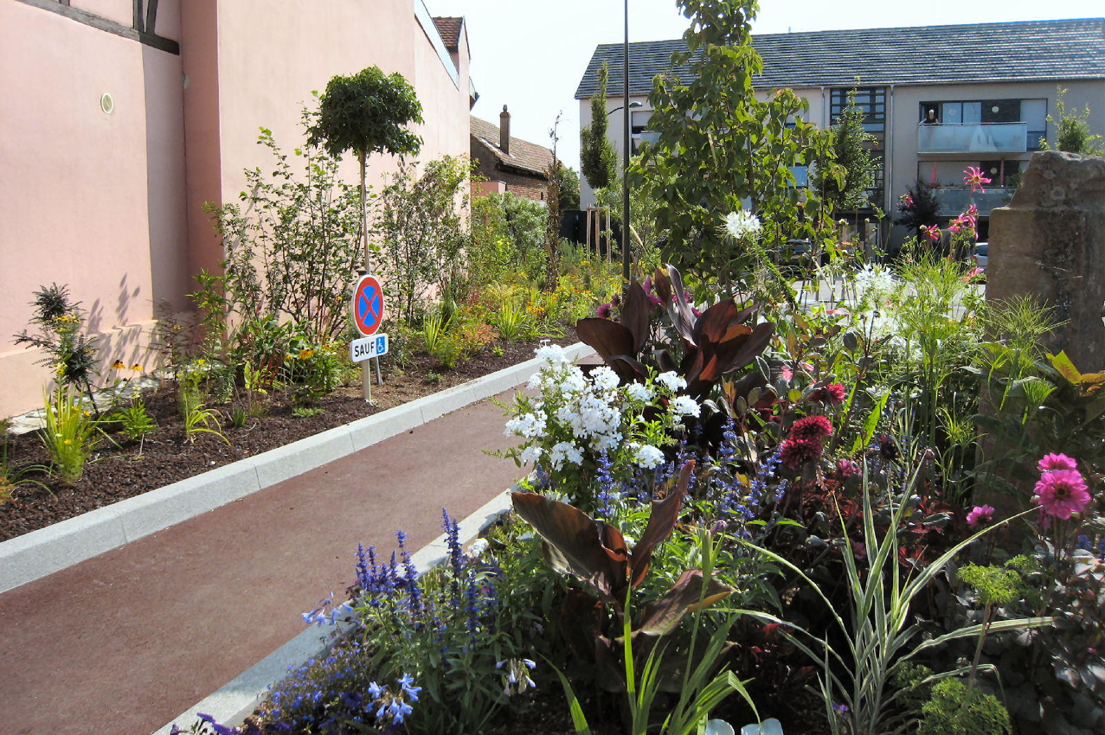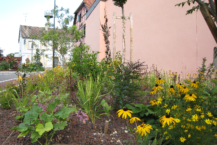 En cette période de congés, c’est Fabrice Roosebeke qui a présenté différents aménagements ornementaux au jury, fin juillet. Ce sont plus particulièrement les parterres de la résidence Dimière, au centre du village, qui intéressaient les quatre professionnels. Ce prix apporte une validation extérieure à un travail collectif de trois années et à des orientations prises depuis quelques temps : tenir compte des contraintes du lieu, limiter les interventions futures et les traitements, offrir quelque chose au regard en toutes saisons. L’équipe technique n’est pas peu fière de sa réalisation. Les végétaux plantés dans du gravier cet hiver se sont bien développés et les fleurs jaunes contrastent avec le rouge de la pouzzolane répandue au sol. Le jury a été sensible aux choix techniques tout comme à la grande variété d’essences mises en œuvre. Un jury « pointilleux mais sympathique qui a posé des questions très ciblées mais a également été porteur de conseils » déclare Fabrice, tout sourire à l’annonce de la nouvelle. Il ajoute « J’ai pris des notes concernant les volumes et les perspectives et retenu des astuces pour limiter les dégâts dus aux escargots notamment ». Un comble pour Fessenheim…
