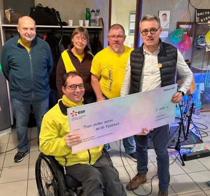 La remise de chèque de la part d’EDF en présence de Florent Petitdemange (coordinateur Téléthon Haut-Rhin Nord) et de Laurent Jarry (directeur du DP2D) a été un moment fort de la soirée.