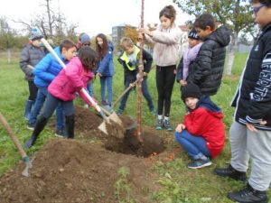 L’arbre, un pommier « haute tige » avait été livré samedi 23 novembre. Il a été mis en jauge afin d’être planté le jour de la fête de Sainte Catherine car un dicton dit : « À la Sainte Catherine, tout bois prend racines ». Au préalable, le service des espaces verts de la commune avait creusé un trou. Avant de commencer, les élèves ont écouté les conseils précieux de Mathieu Algeyer, employé communal et expert en plantation. Sous sa direction, ils ont mis de la terre au fond du trou, posé les racines du pommier sur la terre et rempli le trou de terre tout autour de l’arbre, en faisant attention à ne pas blesser les racines et en maintenant le tronc bien à la verticale. Quand l’arbre fut planté, une cuvette a été formée pour arroser l’arbre et que la terre fasse un pralin autour des racines. Mathieu a aussi ajouté de l’engrais organique pour que le pommier trouve la nourriture nécessaire à son développement. Ensuite il a enfoncé un tuteur près de l’arbre pour l’aider à pousser bien droit et à résister au vent. Des élèves de la classe ont encore arrosé l’arbre qui a reçu cinquante litres d’eau.