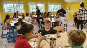 Si les équipements étaient opérationnels et l’équipe d’animation prête à accueillir jusqu’à 50 élèves de l’école élémentaire durant la pause méridienne, ni les tables et chaises, ni le canapé d’angle de la salle d’activité n’ont été livrés. Mais il en fallait plus pour démotiver le service technique communal et l’équipe des Foyers-Clubs d’Alsace qui ont œuvré ensemble, sans relâche, pour que le jour J tout se passe sans encombre, grâce à du mobilier temporaire. Pour cause de fermeture sanitaire de classes, seuls 35 enfants étaient présents les premiers jours, ravis de déjeuner dans un nouveau cadre agréable, «joli» et sympathique. Quelques jours plus tard, le mobilier est enfin livré. À la fois sobre et coloré, il apporte une touche cocooning à l’intérieur où il fait bon se retrouver. La salle d’activité n’est pas très utilisée pour le moment car les enfants peuvent jouer à l’extérieur. En effet, à proximité et par beau temps, ils bénéficient de grands espaces ludiques ou de découverte, comme la cour de l’école, l’aire de jeux et l’arboretum. « C’est un avantage certain » reconnait Ariane De Quenaudon, la directrice. Un bardage de couleur égayera bientôt les façades du bâtiment et l’espace extérieur sera aménagé et fleuri. Souhaitons qu’élèves, parents et animateurs apprécient cette nouvelle structure périscolaire, nommée Arc-en-ciel, à l’image de sa décoration.